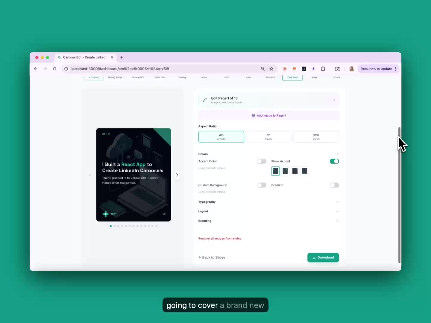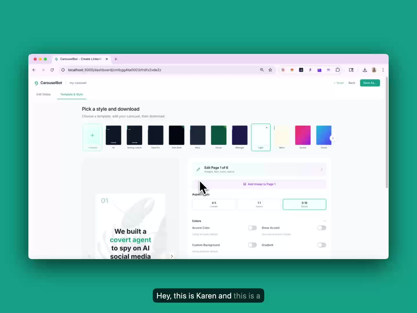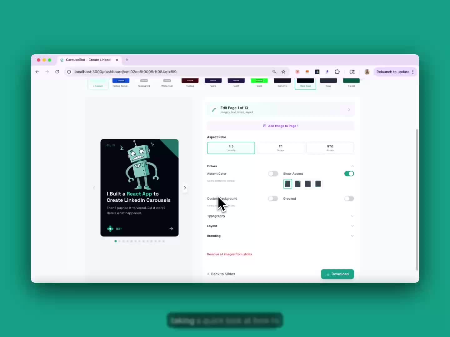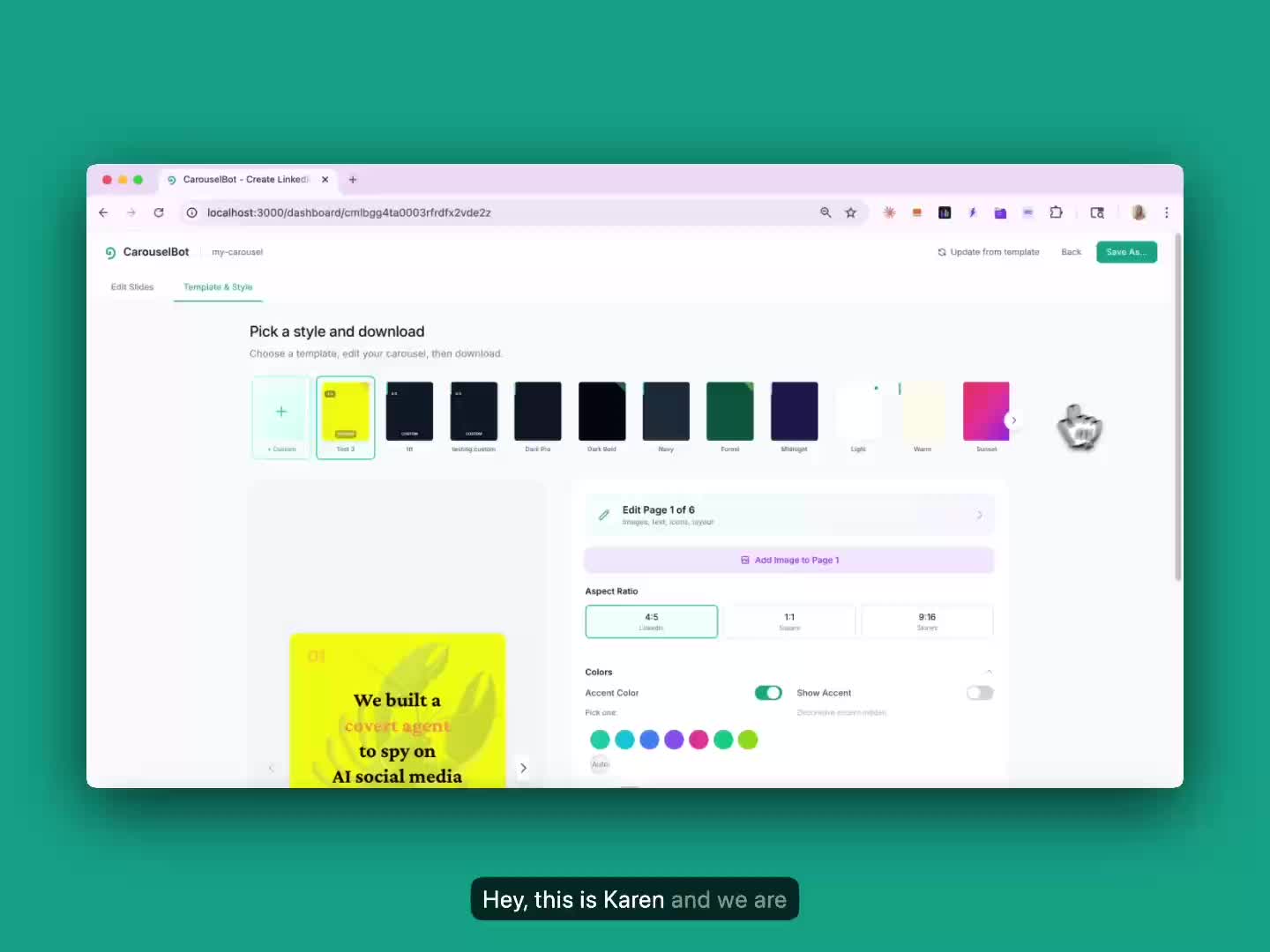 Create templates with your own colors, fonts, and aspect ratios.